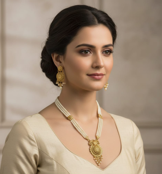 Elevate your style with this exquisite gold-plated long necklace set, featuring lustrous pearls for a timeless look. Perfect for weddings, parties, or festive occasions, this necklace adds elegance to any outfit. Durable, lightweight, and crafted for comfort, it’s a must-have accessory for women who love classic jewelry with a modern touch.
