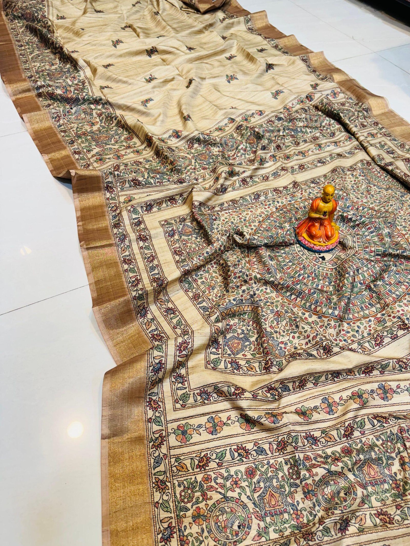Handcrafted Tussar Silk Saree with Madhubani-Inspired Floral & Circular Motifs – Beige & Bronze