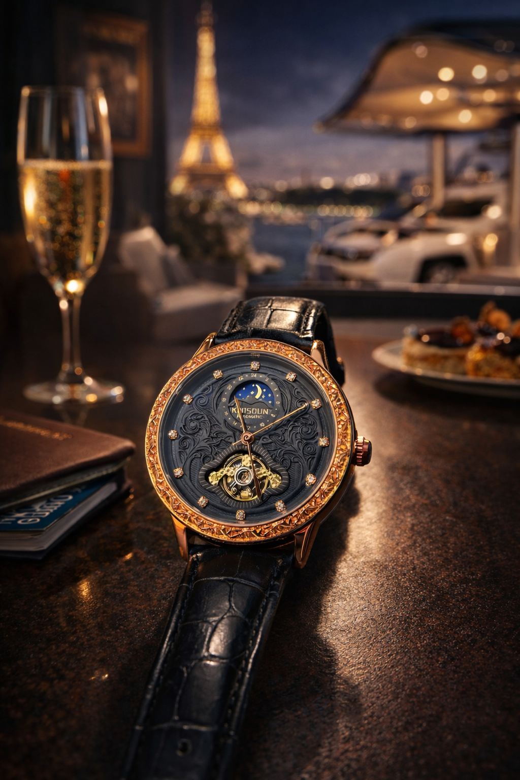 Powered by a fully automatic mechanical movement, the watch operates without batteries, drawing energy from your natural wrist movement. The transparent case back reveals the intricate inner mechanism, highlighting the craftsmanship, balance wheel, and synchronized gear system that define true horological excellence.