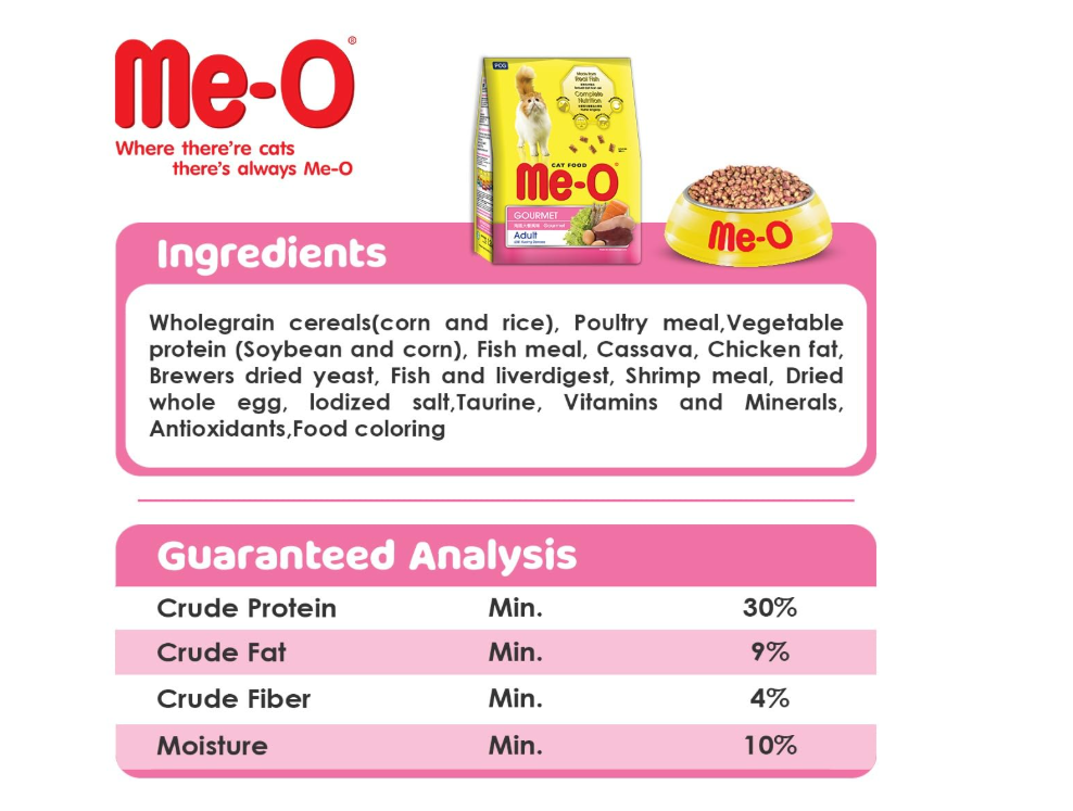 Me-O Cat Food is an optimally balanced and nutritionally complete cat food with high palatability and digestibility. The delicious, nutritious and crunchy nature of Me-O Cat Food makes your beloved feline fall for it right from the very first bite. Just be sure you always have a bowl of clean drinking water nearby for your loving pet.