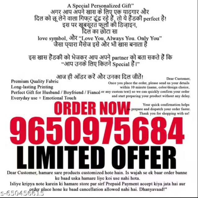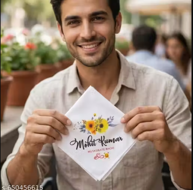 Show your affection with this personalized printed handkerchief, featuring a delicate floral design. Made from premium soft cotton, it’s gentle on the skin and perfect for everyday use or as a thoughtful gift for your loved one. Lightweight and easy to carry, this handkerchief combines practicality with a personal touch, making it ideal for special occasions or daily use.