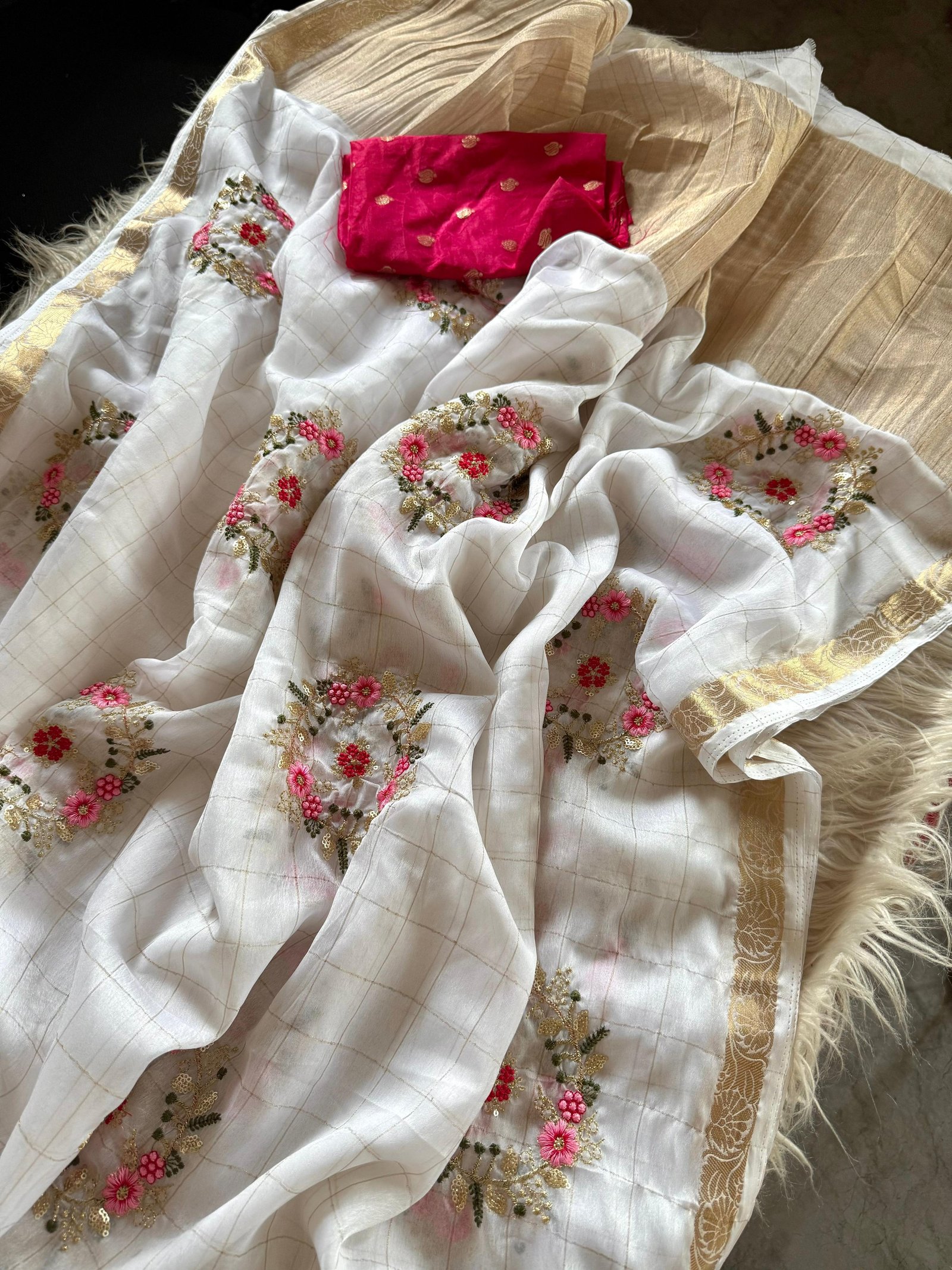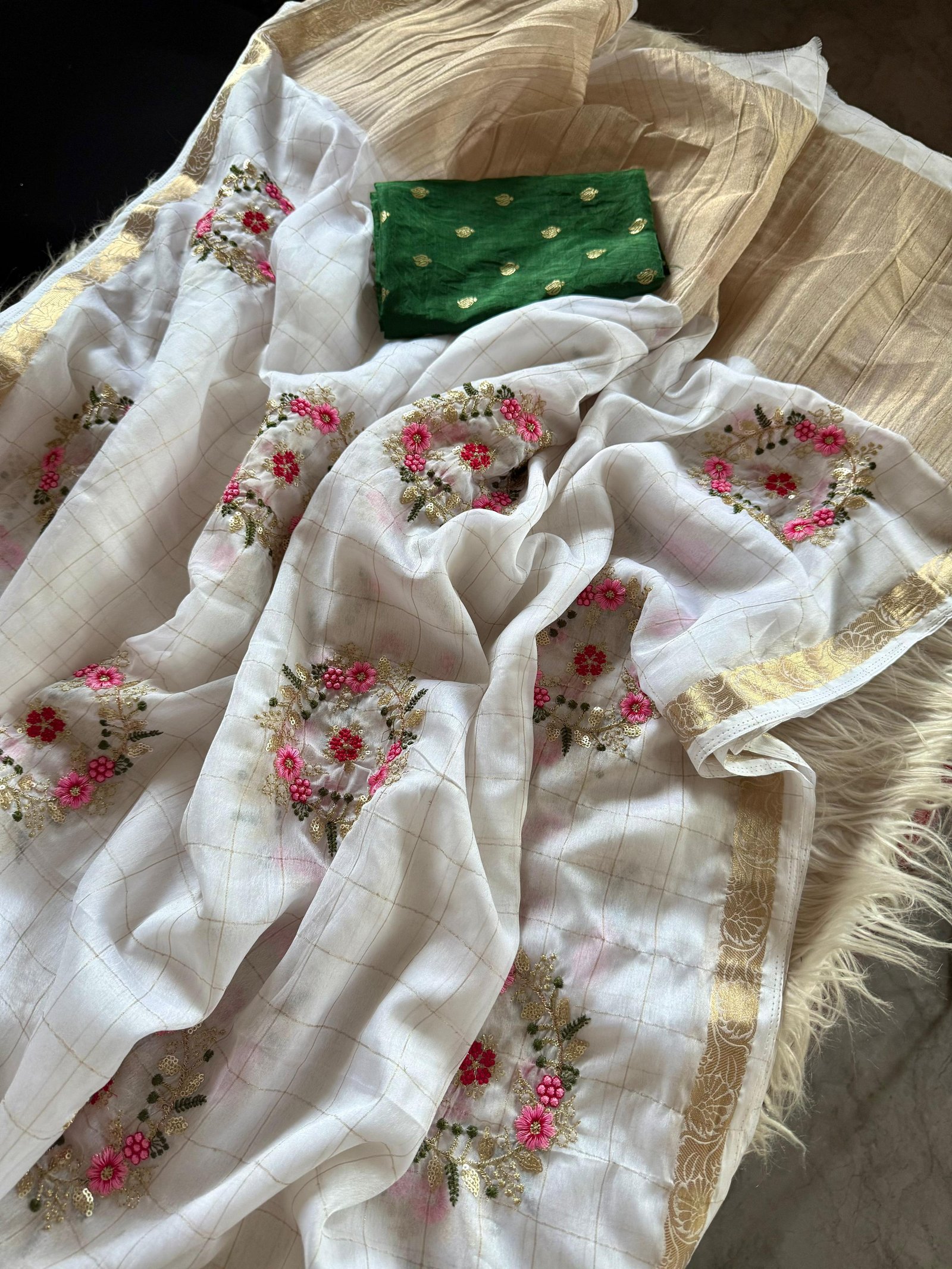 Pure Chinnon Viscose Chex Saree with Multi Embroidery & Sequins, Paired with Viscose Buti Blouse