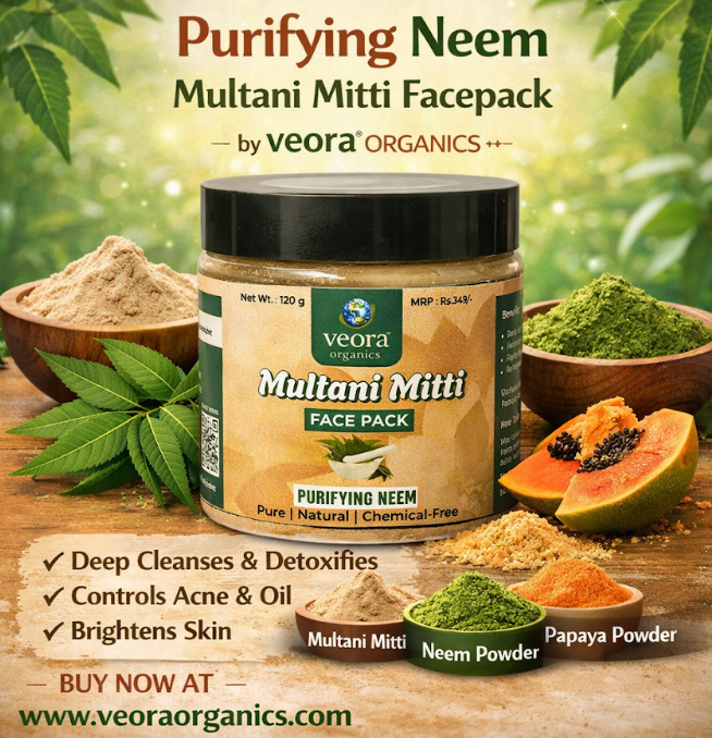 Experience the ultimate purification with Purifying Neem by Veora Organics, a luxurious 100% pure and organic face pack designed to deeply cleanse, detoxify, and rejuvenate your skin. This powerful blend combines the purifying properties of Multani Mitti, the antibacterial benefits of Neem, and the revitalizing power of Papaya Powder for naturally radiant and refreshed skin.