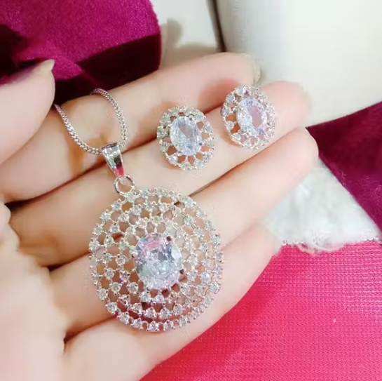 Silver Plated Luxury American Diamond Heart Crystal Pendant & Earrings Combo