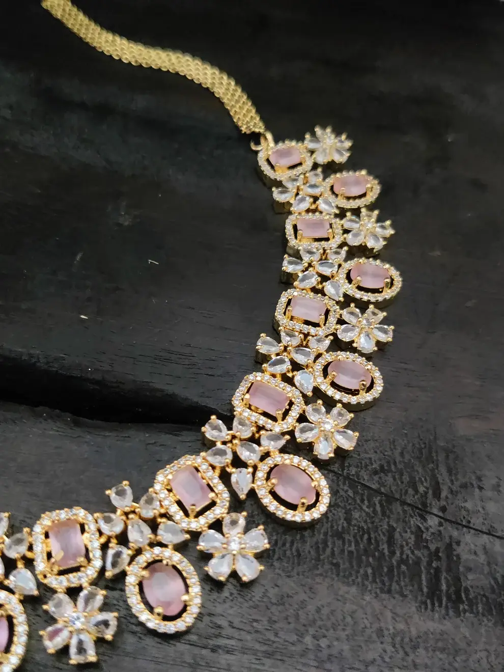 Add a touch of elegance and charm to your look with this Yellow Gold Plated Necklace Set, featuring sparkling pink cubic zirconia stones. Perfect for weddings, parties, festive occasions, or gifting, this set includes matching earrings for a complete stylish ensemble.
