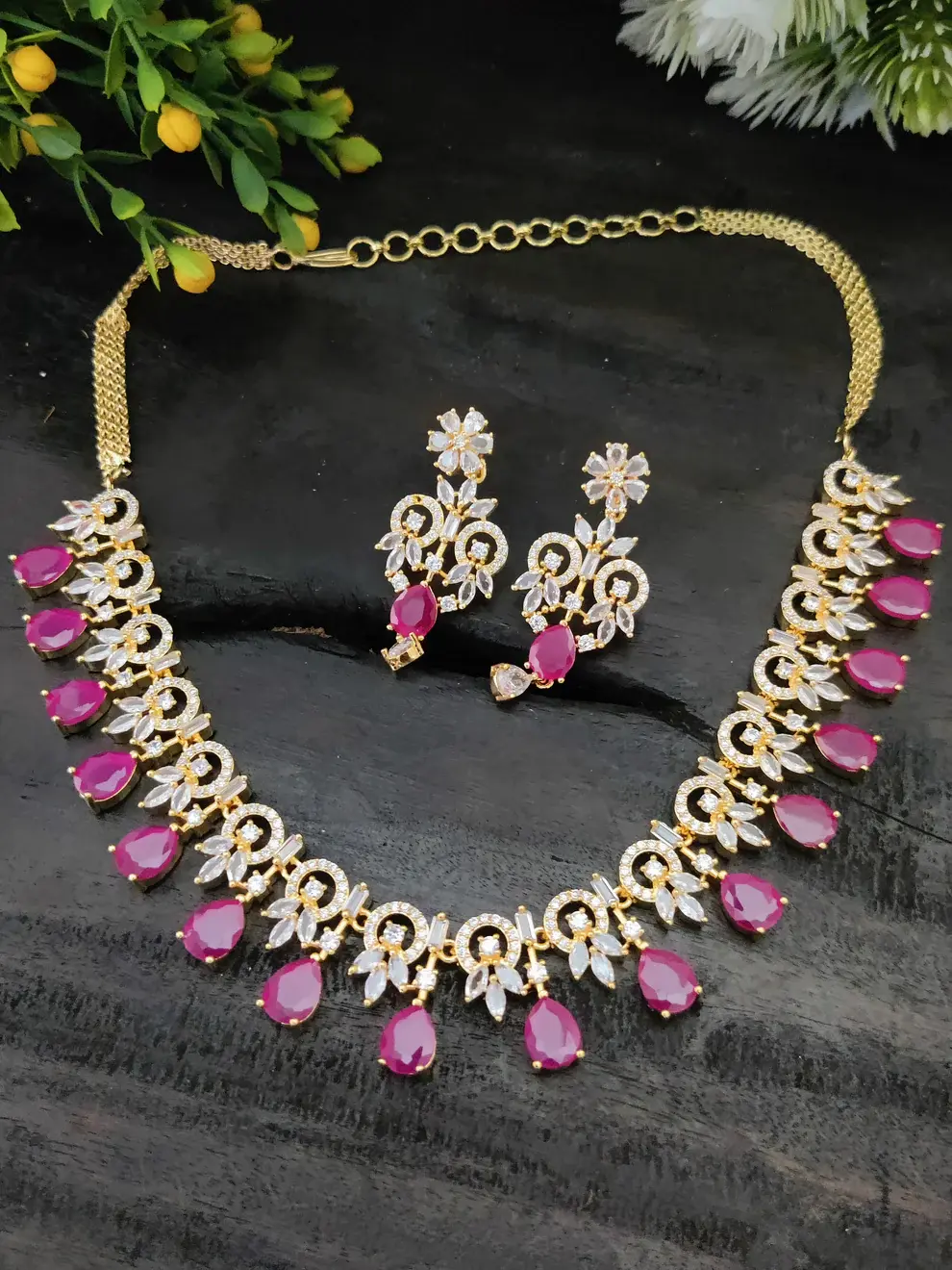 Add a regal touch to your look with this Yellow Gold Plated Necklace Set, adorned with dazzling ruby cubic zirconia stones. Perfect for weddings, parties, festive occasions, or gifting, this set includes matching earrings to complete your elegant ensemble.