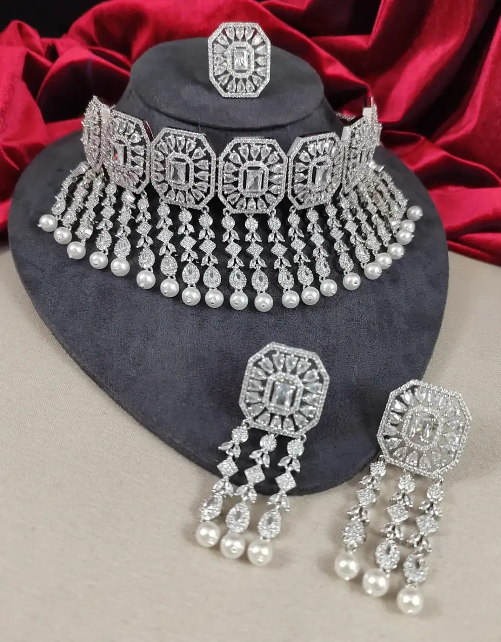 ✨ Silver-Toned Pearl & Cubic Zirconia Choker Set ✨