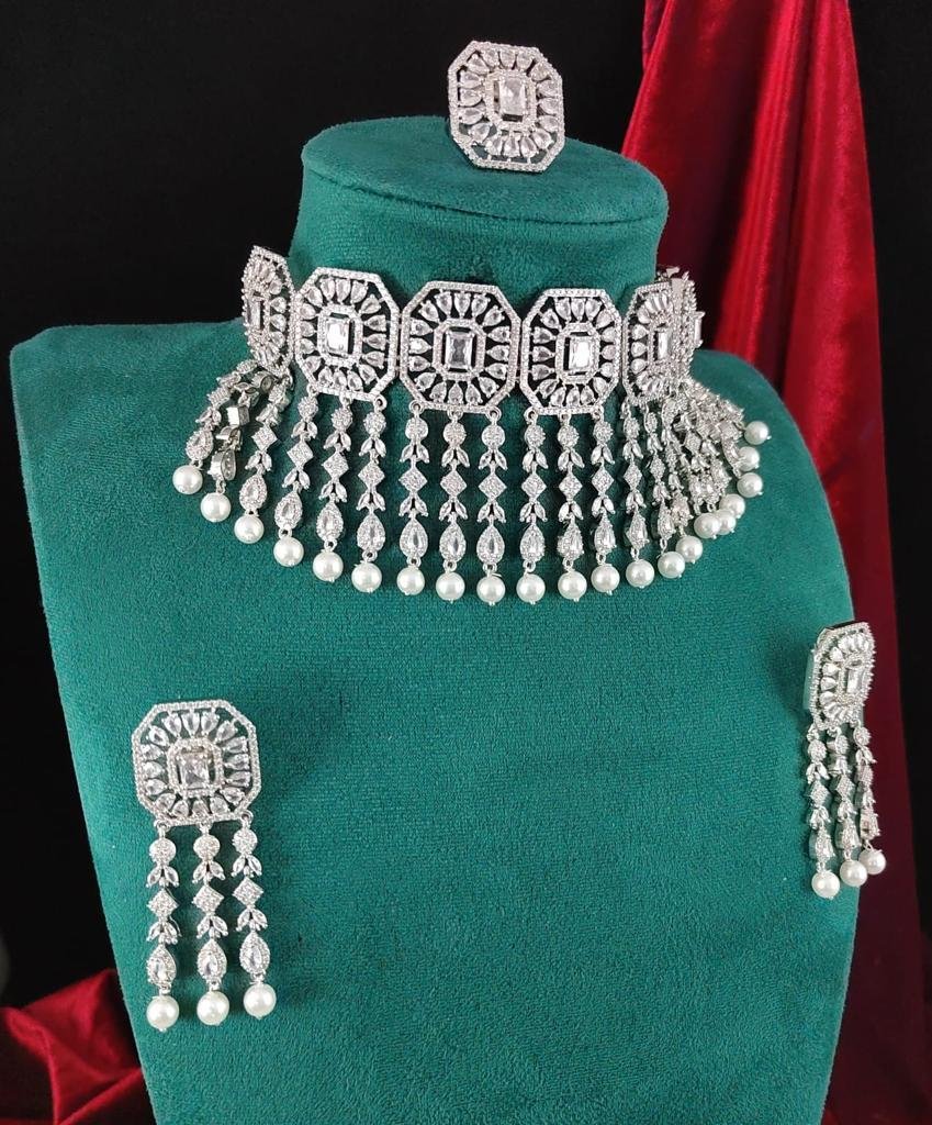 Elevate your wedding or festive look with this Silver-Toned Choker Set, featuring a stunning combination of pearl and cubic zirconia stones. This exquisite set includes a choker, matching earrings, and an adjustable ring, offering a complete, coordinated ensemble for special occasions.