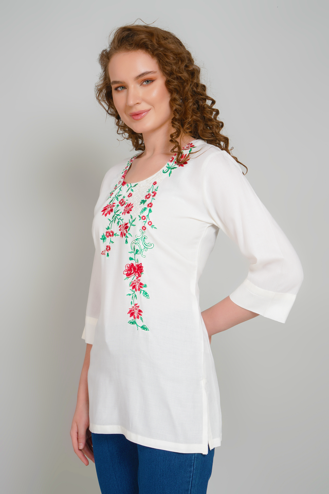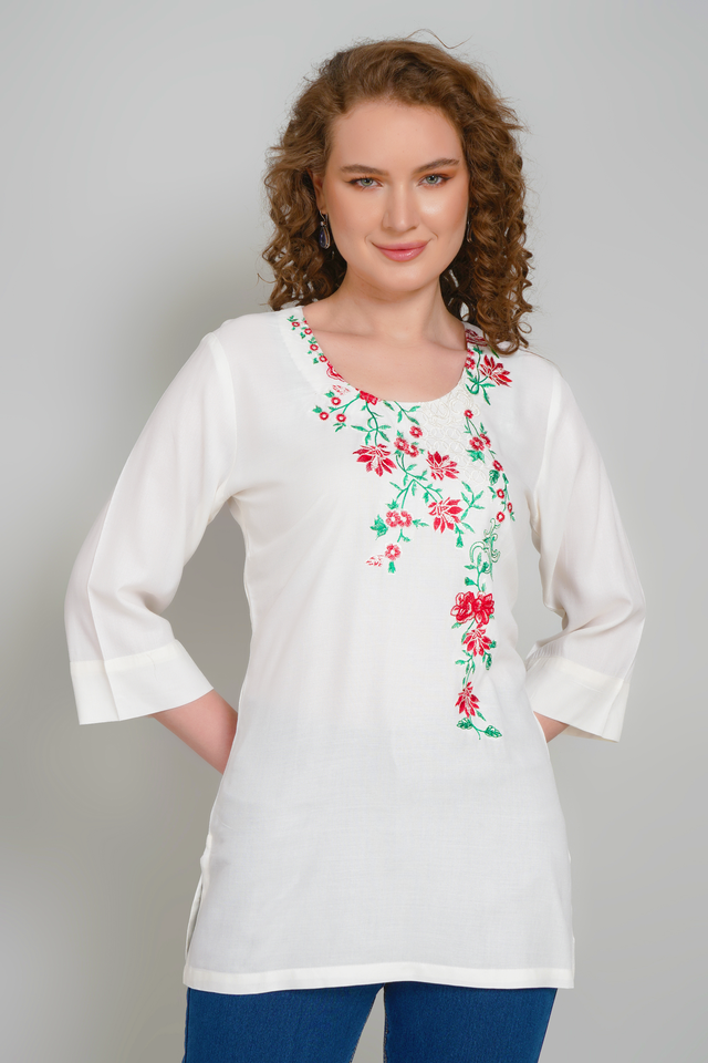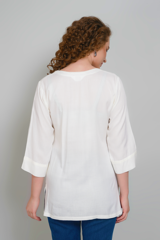Made from soft, breathable rayon, the Sufiana White Tunic blends timeless elegance with everyday comfort. Lightweight and versatile, it’s perfect for office wear, casual outings, or festive occasions. Pair it with leggings, palazzos, or jeans for a graceful ethnic fusion look.