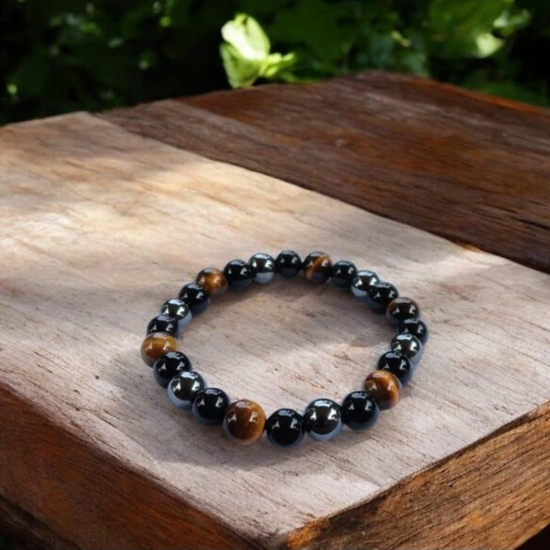 The Triple Protection Bracelet is a powerful accessory designed to shield you from negative energies and promote emotional stability. Crafted with a harmonious blend of Hematite, Tiger's Eye, and Black Obsidian, this bracelet serves not only as a stunning piece of jewellery but also as a formidable tool for protection and grounding.