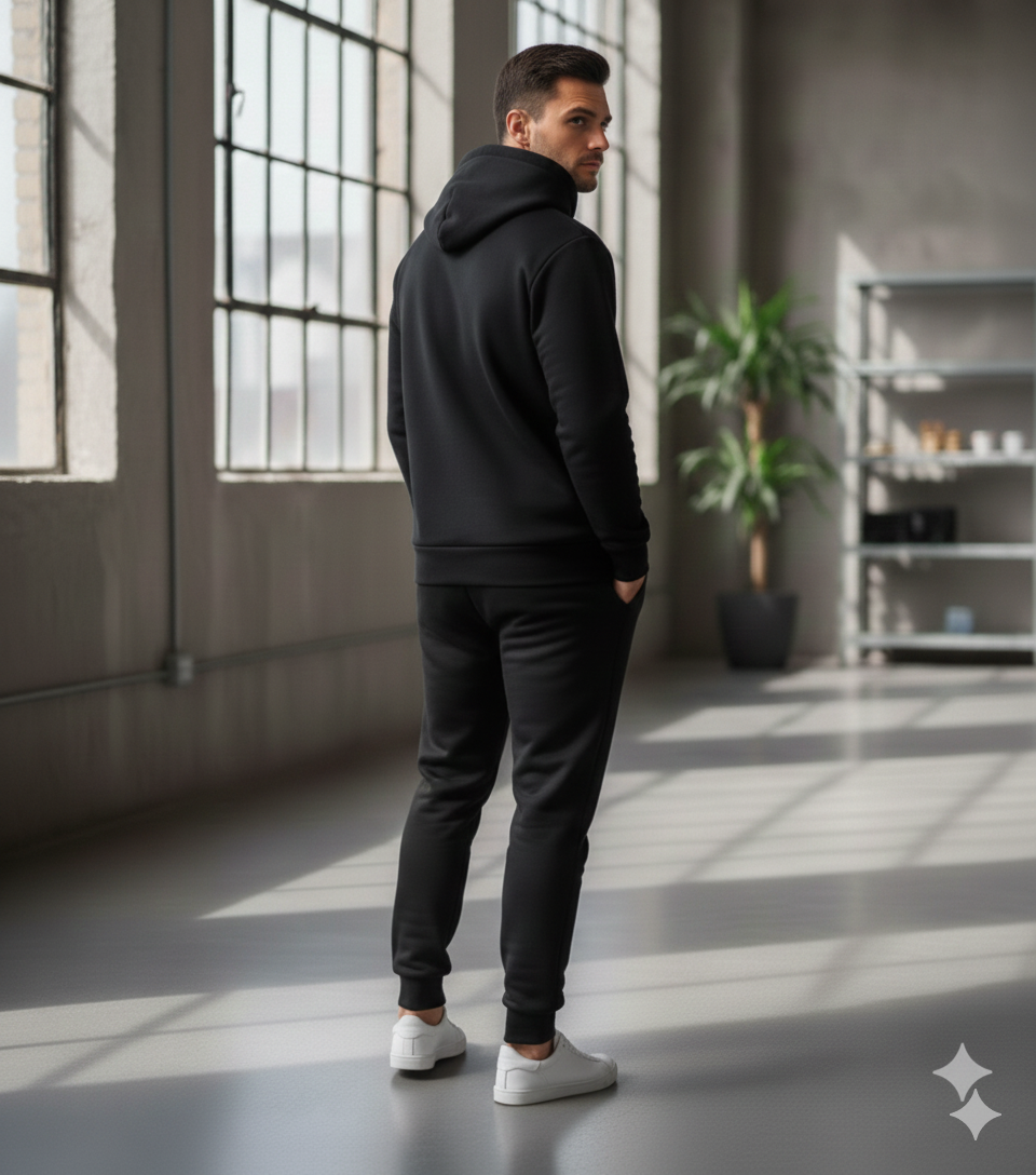 A black tracksuit is a stylish and comfortable outfit designed for both athletic activity and casual wear. It typically includes a matching jacket and pants, made from soft, breathable materials such as polyester, cotton blends, or fleece.