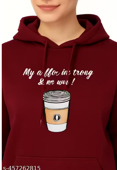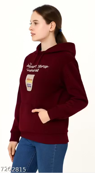 Add a stylish edge to your casual wardrobe with this Maroon Printed Hoodie for Women. Crafted from soft cotton fabric, this pullover hoodie features a trendy typography print, kangaroo pockets, and tie-up hood for a cozy yet fashionable look. The cuffed long sleeves and regular length make it perfect for daily wear, winter outings, or casual styling. Comfortable, trendy, and easy to pair with jeans or joggers.