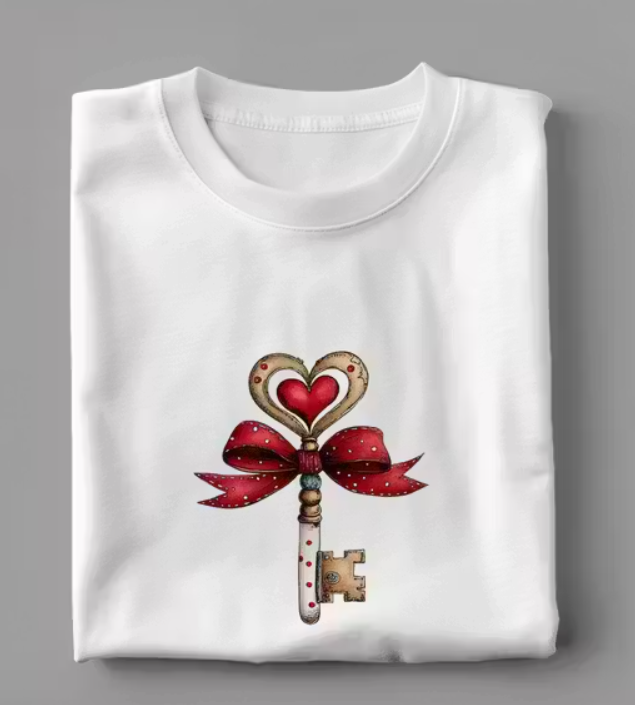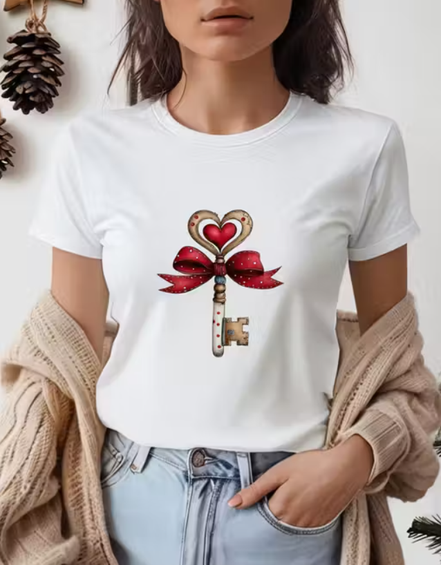White Heart Key with Red Bow Printed T-Shirt | Love Theme Casual Round Neck Tee white printed t shirt, heart key print t shirt, love theme t shirt, red bow design t shirt, casual round neck tee, aesthetic t shirt, daily wear t shirt, minimalist graphic t shirt, valentine theme t shirt, trendy print t shirt