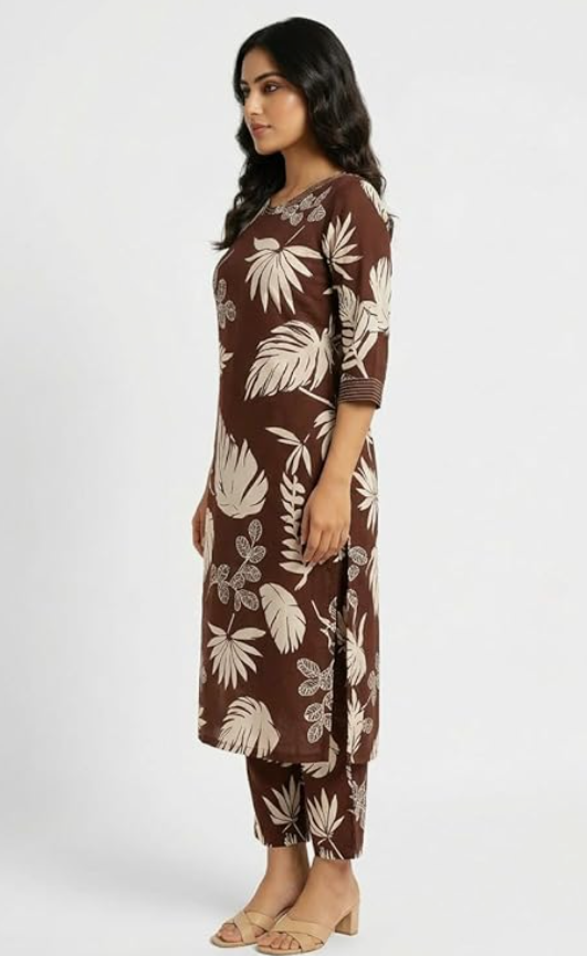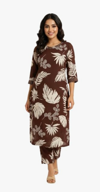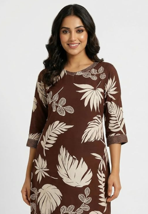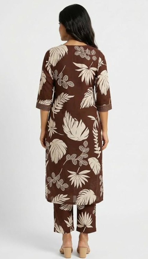 - STYLISH DESIGN: Women's brown kurta with pant set featuring an elegant tropical leaf and floral print pattern in cream and beige tones for a contemporary ethnic look
