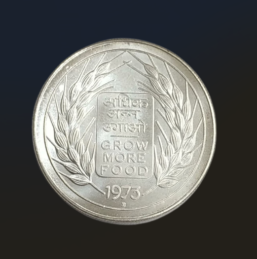 The Grow More Food coins were issued by the Government of India in 1973 as part of a series commemorating the country’s agricultural development initiatives, especially during the era of the Green Revolution when increasing food production was a national priority. These coins were struck in multiple denominations as part of the FAO (Food and Agriculture Organization) series to promote the message of food security and agricultural self‑sufficiency.