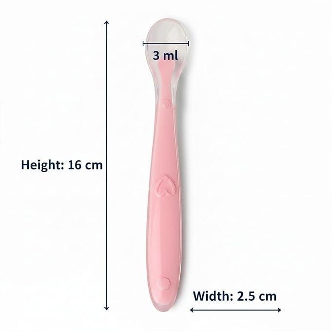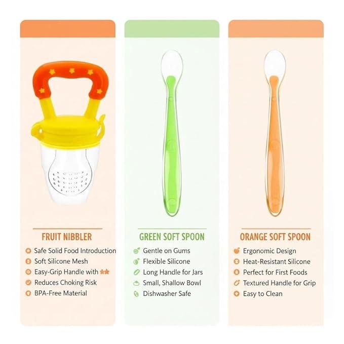 - Complete Feeding Set: Includes 2 soft silicone feeding spoons in green and orange colours, plus 1 fruit feeder with yellow base and orange handle for introducing solids to babies