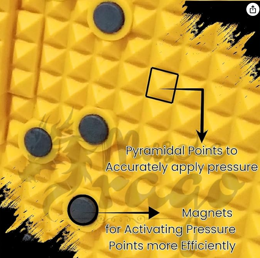 - ✅ Multipurpose Acupressure Mat – This acupressure mat for feet helps stimulate key points of acupressure, promoting full-body relaxation, improved blood flow, and natural pain relief. Acupressure mat for feet ACUPRESSURE DESIGN: Features magnetic pyramidal nodes strategically placed across the mat surface to target key pressure points in feet for enhanced therapeutic benefits