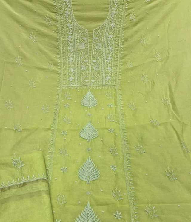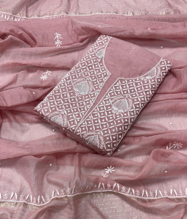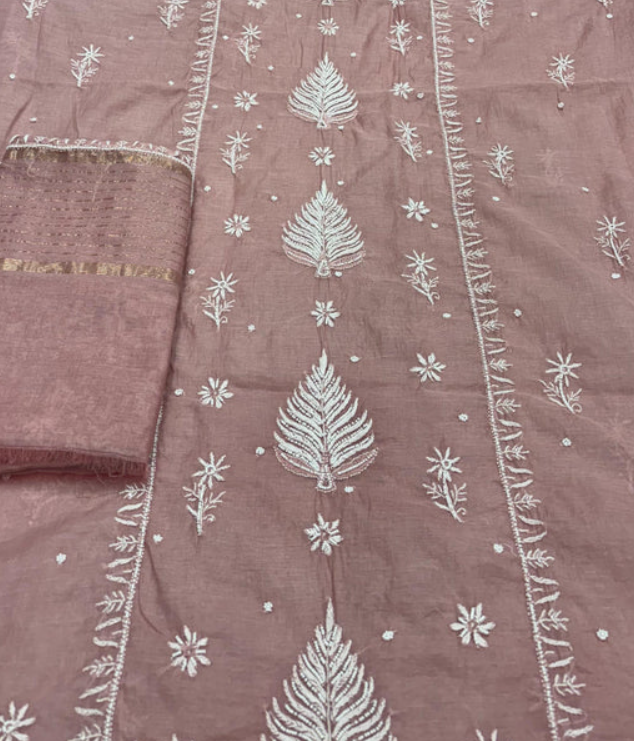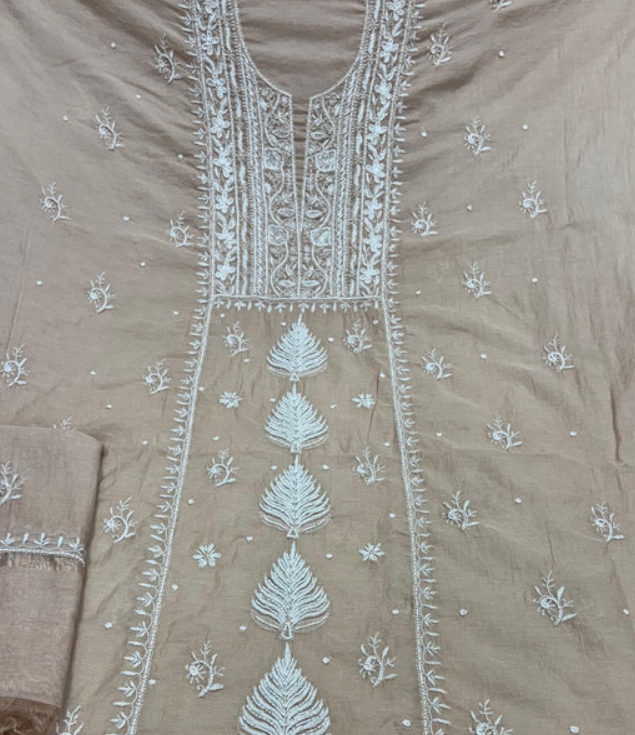 Product Description-  Pure Mulmul unstitched kurta piece with beautifully done premium handwork chikankari and Pearl work all over paired with a matching Pure Mulmul Zari Dupatta with Chikankari handwork & pearl cut daana work.
