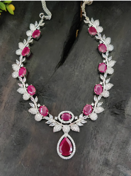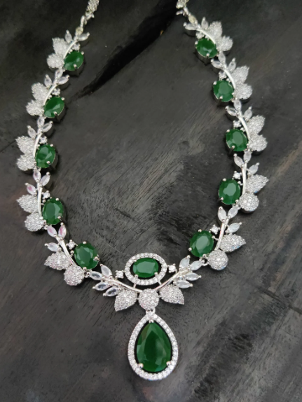 Elevate your style with this stunning American Diamond necklace set, featuring high-quality stones and a deep white gold rhodium plating for a radiant, long-lasting shine. The sparkling green CZ zircon stones add a vibrant touch of elegance, making this set perfect for weddings, parties, and festive occasions.