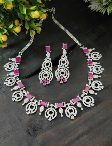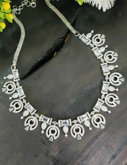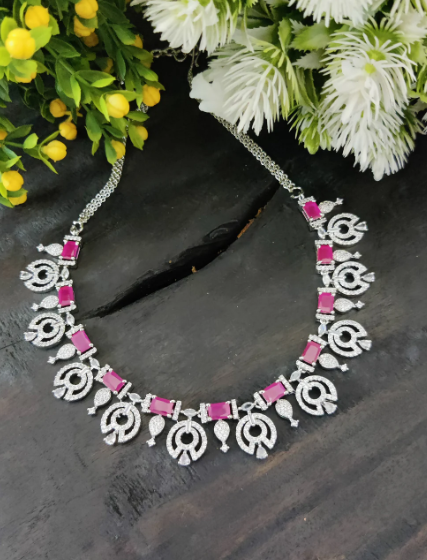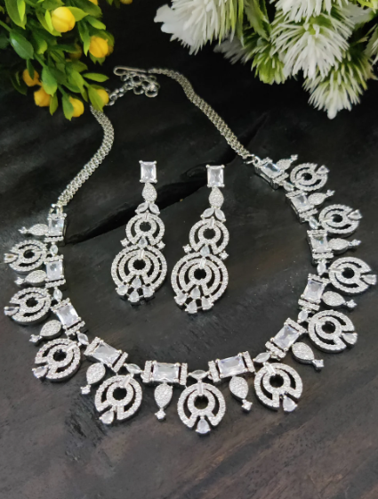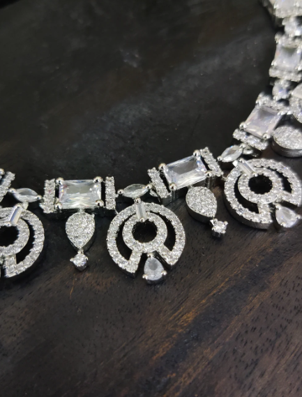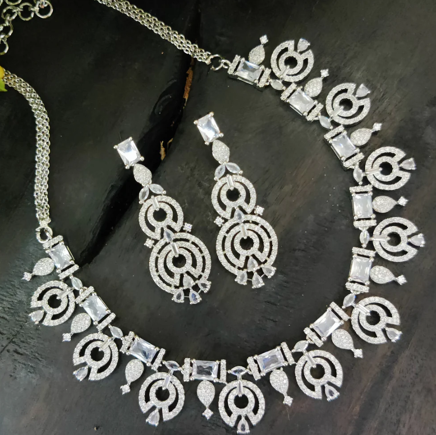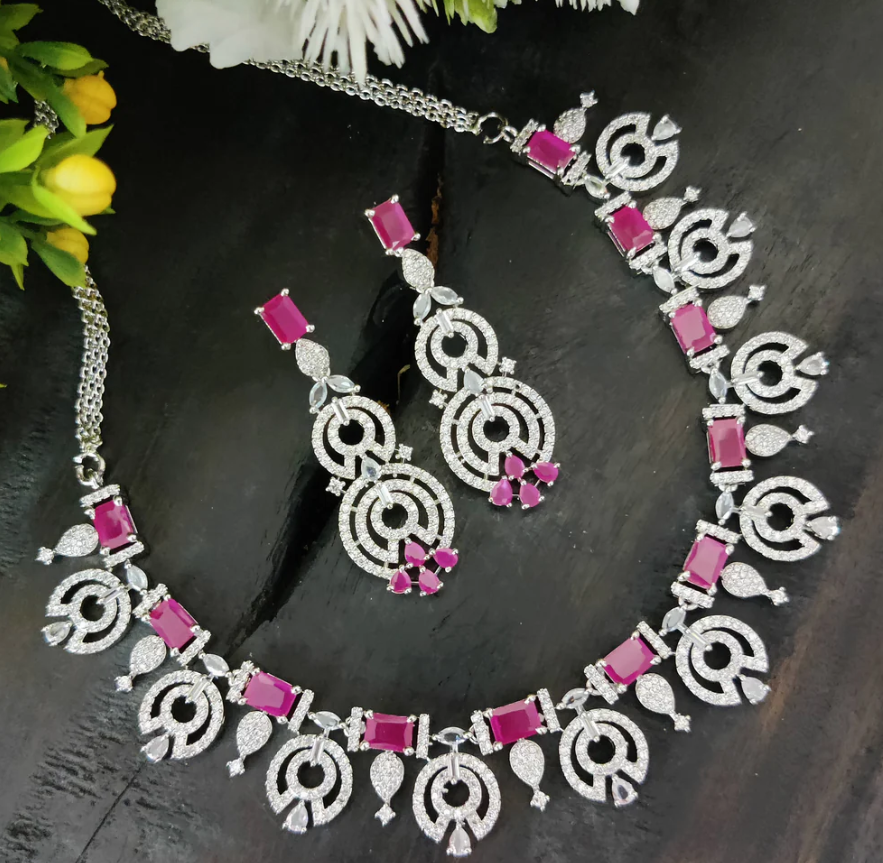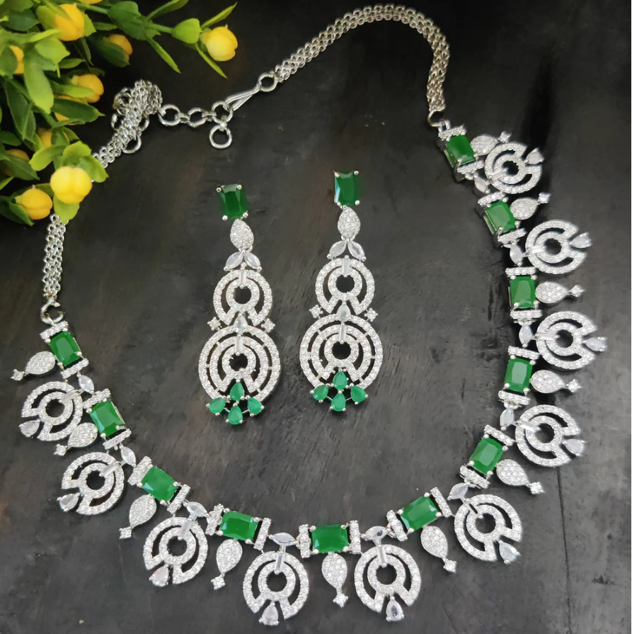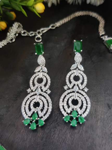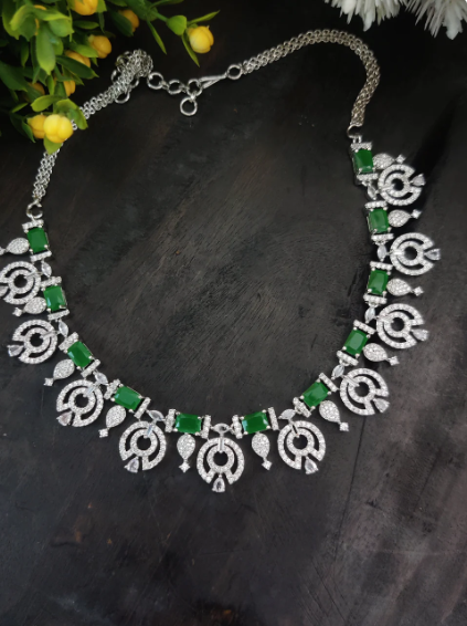 Enhance your elegance with this beautiful American Diamond necklace set, crafted with premium-quality stones and finished in deep white gold rhodium plating for a rich, long-lasting shine. The striking green CZ zircon stones add a royal touch, making this set perfect for weddings, parties, and festive occasions.