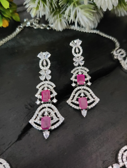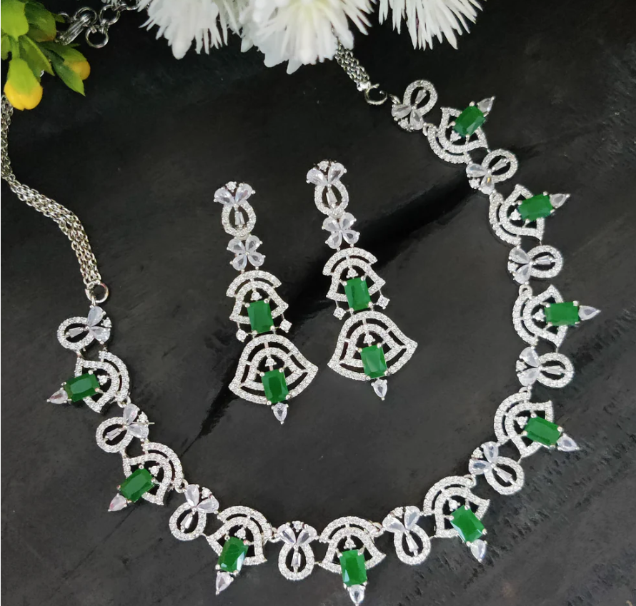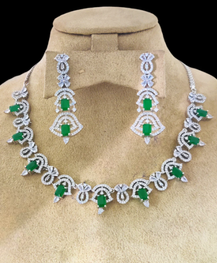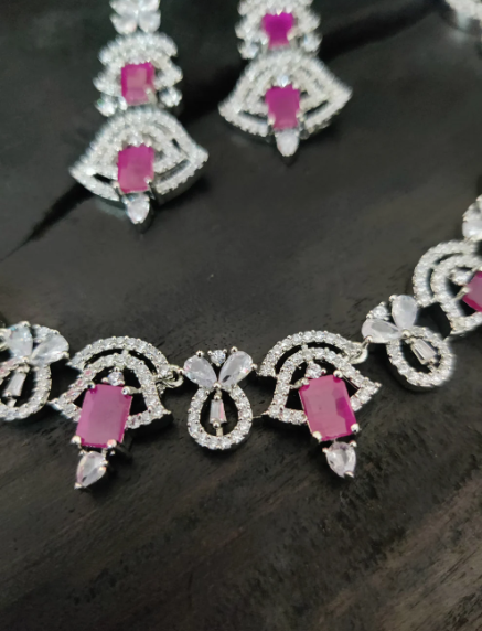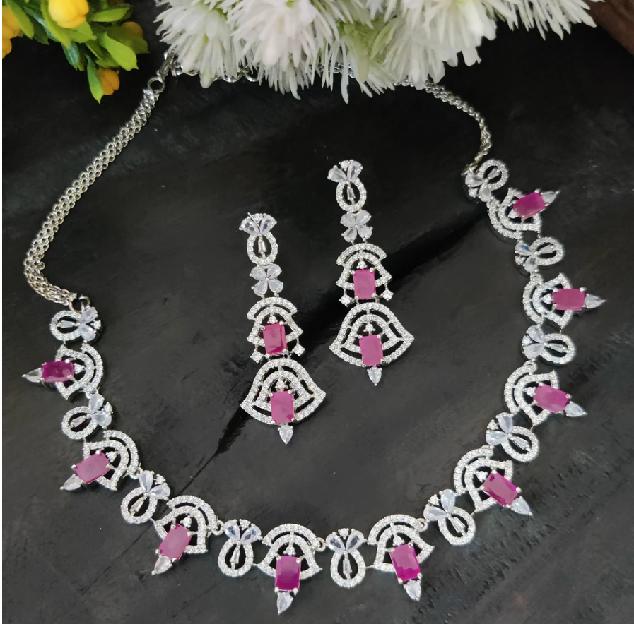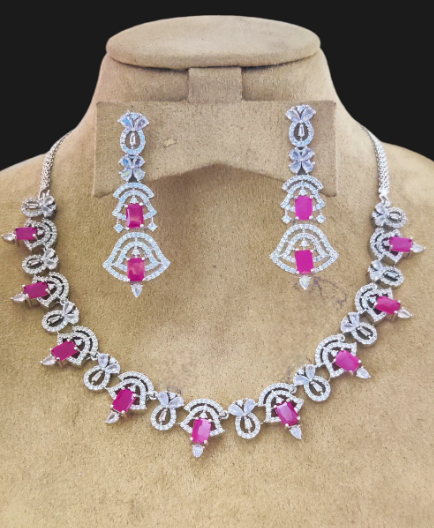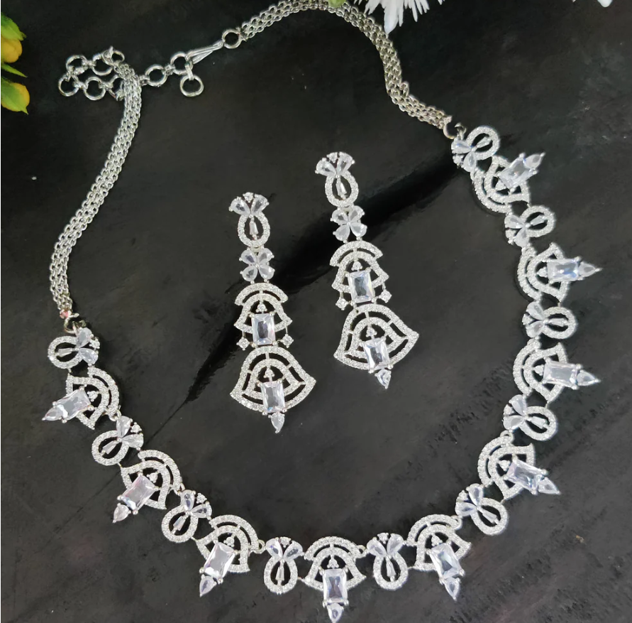 Add timeless elegance to your jewelry collection with this beautiful American Diamond necklace set, crafted with high-quality Cubic Zircon (American Diamond) stones and finished in deep white gold rhodium plating for a rich, long-lasting shine. Its graceful design makes it perfect for both festive and party wear.