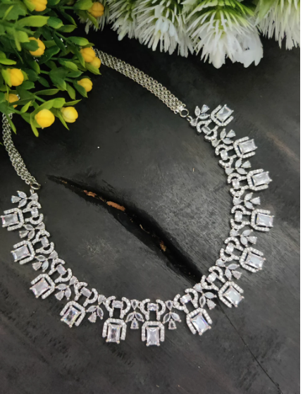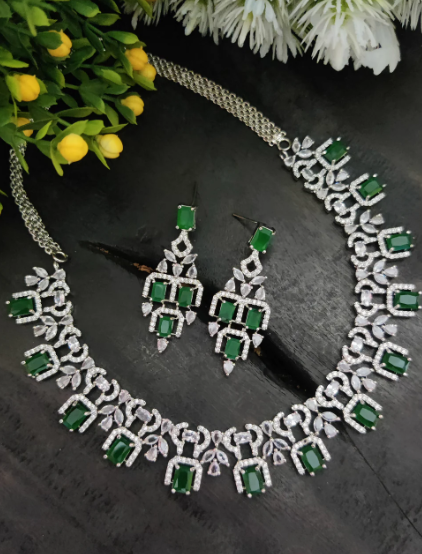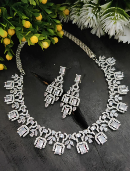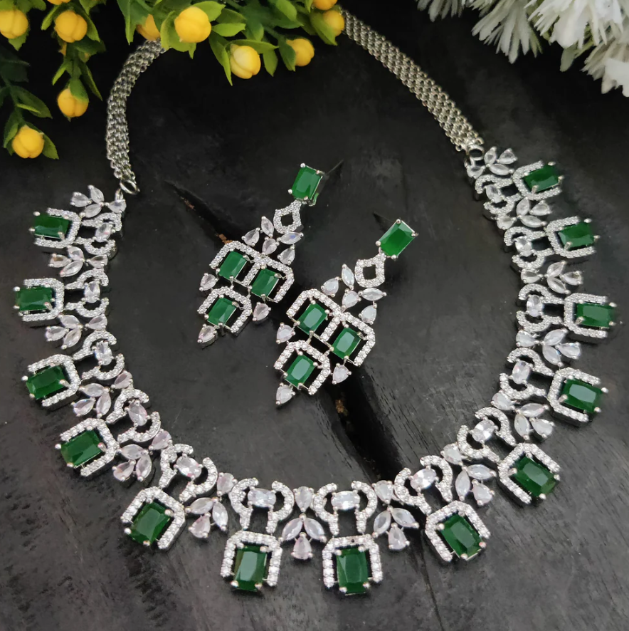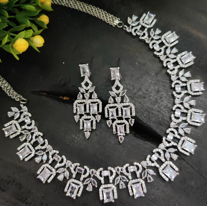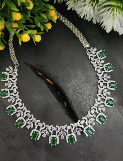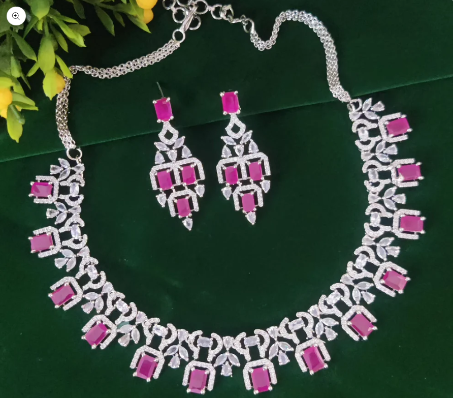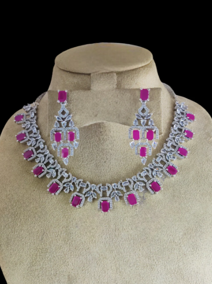 Make a graceful style statement with this beautiful American Diamond necklace set, crafted with high-quality stones and finished in deep white gold rhodium plating for a brilliant, long-lasting shine. The rich ruby CZ zircon stones add a touch of royal elegance, making this set perfect for special occasions.