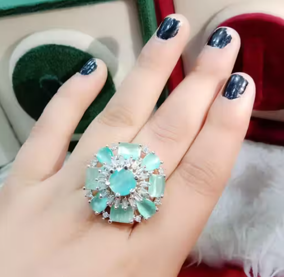 American diamonds Studded Silver Tone Floral Adjustable AD Ring for Women