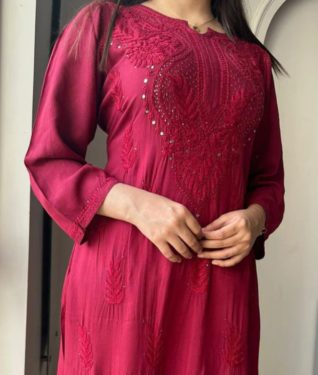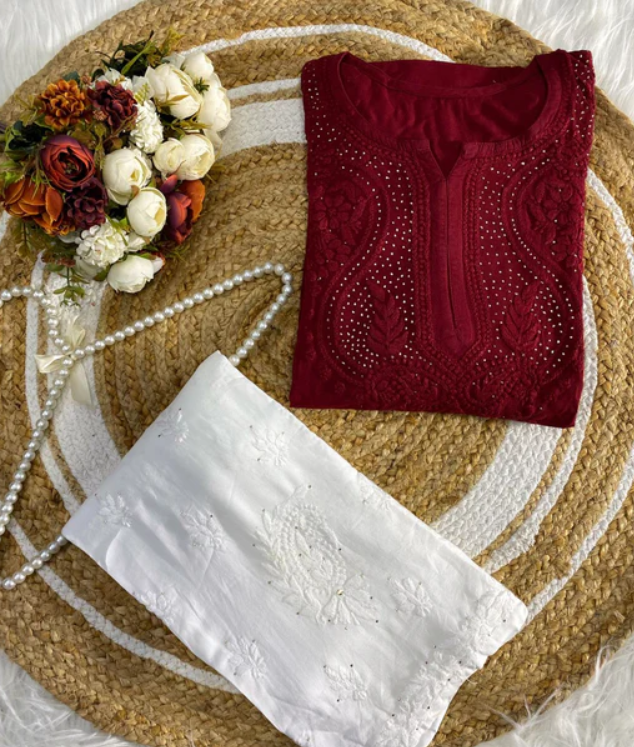 - ✨ Handcrafted Mokaish Chikankari: Detailed maroon thread embroidery adds sophistication and charm.