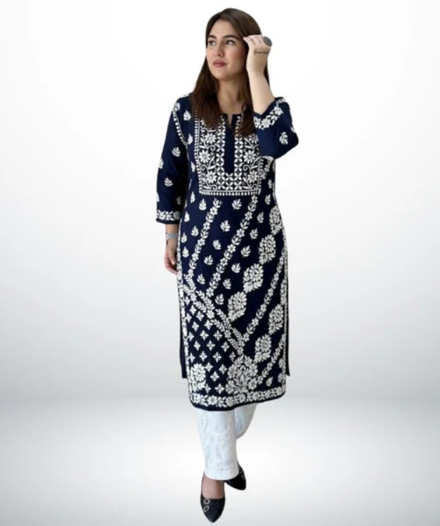 Discover timeless elegance with the ANAYA Navy Blue Lucknowi Chikankari Kurti, crafted from premium heavy modal fabric that offers a luxuriously soft feel, graceful drape, and exceptional all-day comfort. Adorned with intricate hand-style Lucknowi Chikankari work, this kurti beautifully reflects traditional craftsmanship with a modern touch.