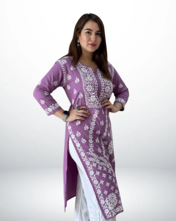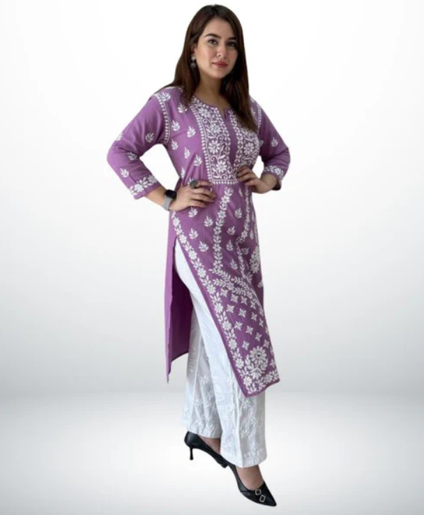 Discover timeless grace with the ANAYA Purple Lucknowi Chikankari Kurti, beautifully crafted from premium heavy modal fabric that delivers a luxurious, flowy drape and unmatched all-day comfort. The exquisite hand-style Lucknowi Chikankari embroidery enhances its classic appeal, making it a perfect choice for festive occasions, casual outings, or sophisticated everyday wear.
