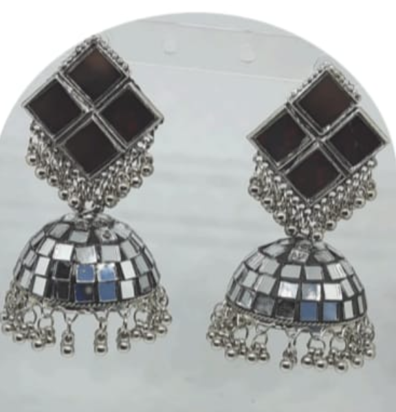 - Oxidized Dome Shaped Jhumkas – Classic oxidized dome style with dangling beads — versatile with ethnic or indo-western outfits.