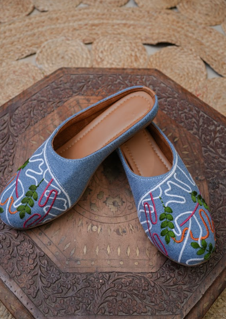 These stylish slip-on mules are crafted from soft denim fabric and elevated with bold, artistic embroidery. Featuring flowing abstract lines in red, white, and blue alongside delicate green leaf motifs, the design blends modern creativity with nature-inspired detail. The closed-toe, backless silhouette offers easy wear, while the cushioned insole ensures everyday comfort. Set against a handcrafted, rustic backdrop, these mules carry a subtle bohemian charm—perfect for adding a unique, expressive touch to casual outfits or relaxed weekend looks.