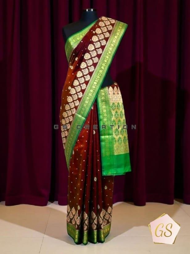 * Premium Banarasi weaving with rich gold zari