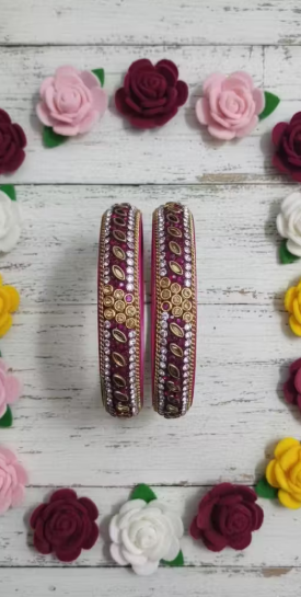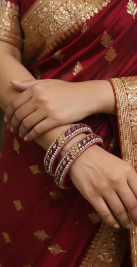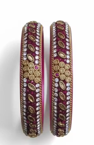 Add elegance to your ethnic party wear with this beautiful maroon glass bangle set, designed in a floral trend and embellished with Cubic Zirconia (American Diamond) stones for a graceful sparkle. Featuring a secure hook closure and a non-adjustable fit, this bangle set perfectly complements sarees, lehengas, and traditional outfits. Expertly crafted in India, it blends classic charm with festive style.