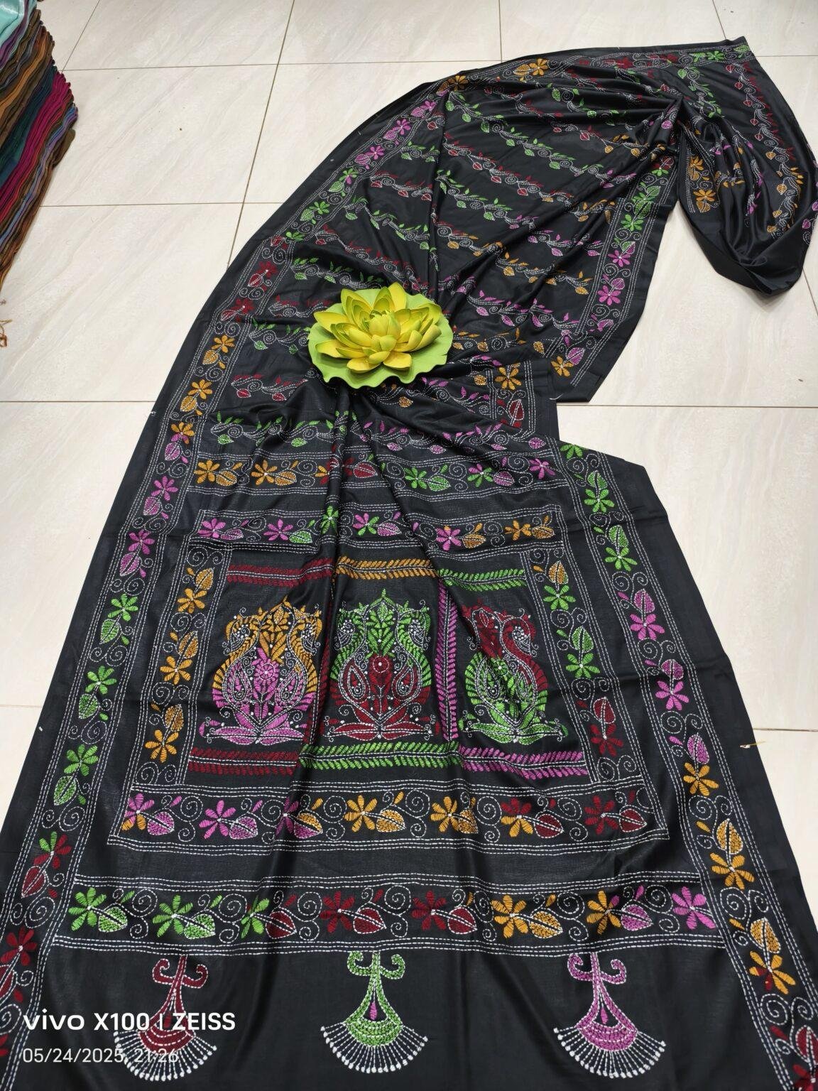 Black Assam Silk Saree with Vibrant Multicolour Kantha Embroidery