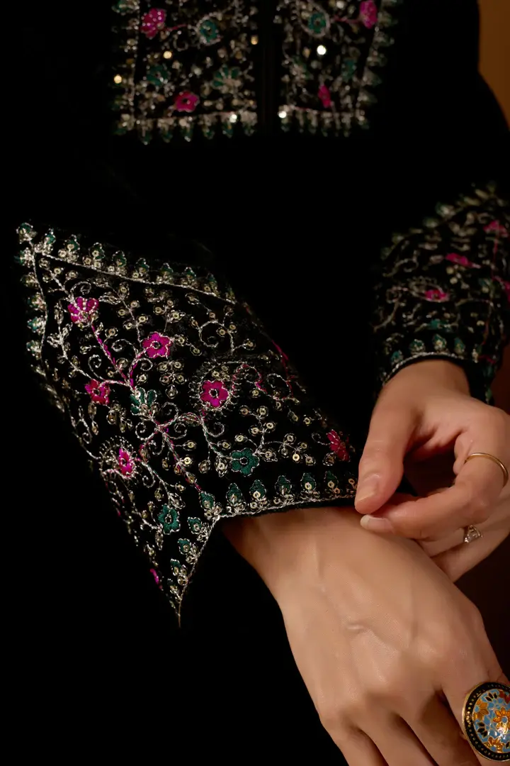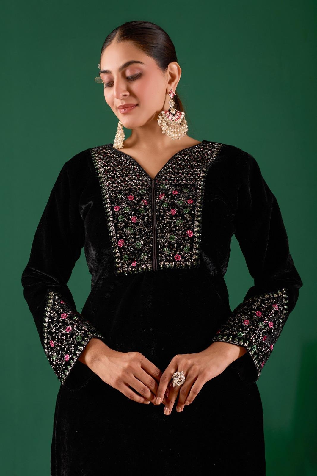 Step into elegance with the luxurious Black Beauty Velvet Set Vol-2, designed to make a bold and graceful statement. Crafted from premium heavy velvet fabric, this set offers a rich texture and a royal feel. The kurti is beautifully adorned with intricate embroidery work, adding sophistication and timeless charm.