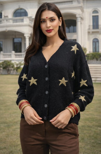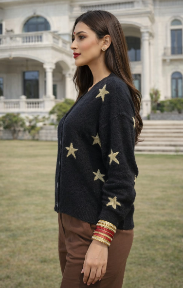 Add a touch of sparkle to your winter wardrobe with this Black Cardigan with Gold Star Pattern. Designed with a stylish star print and soft knit fabric, this cardigan offers both comfort and a trendy look. The elegant black base with gold stars creates a chic and eye-catching style, perfect for casual outings, parties, or everyday winter fashion. Pair it with jeans, skirts, or dresses for a fashionable layered outfit.