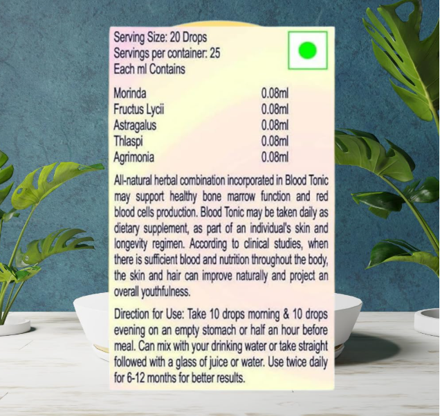 - blood tonic drops support normal oxygenation of blood. prevent from weakness, stress and fatigue. support body in heavy menstrual bleeding disorders. support healthy skin and an overall youthfulness. blood tonic drops can support health hair and nails.