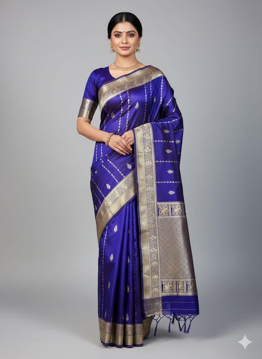 - Peacock Blue‑Gold Banarasi Saree – Rich peacock-blue base with gold detailing — perfect for festive occasions.