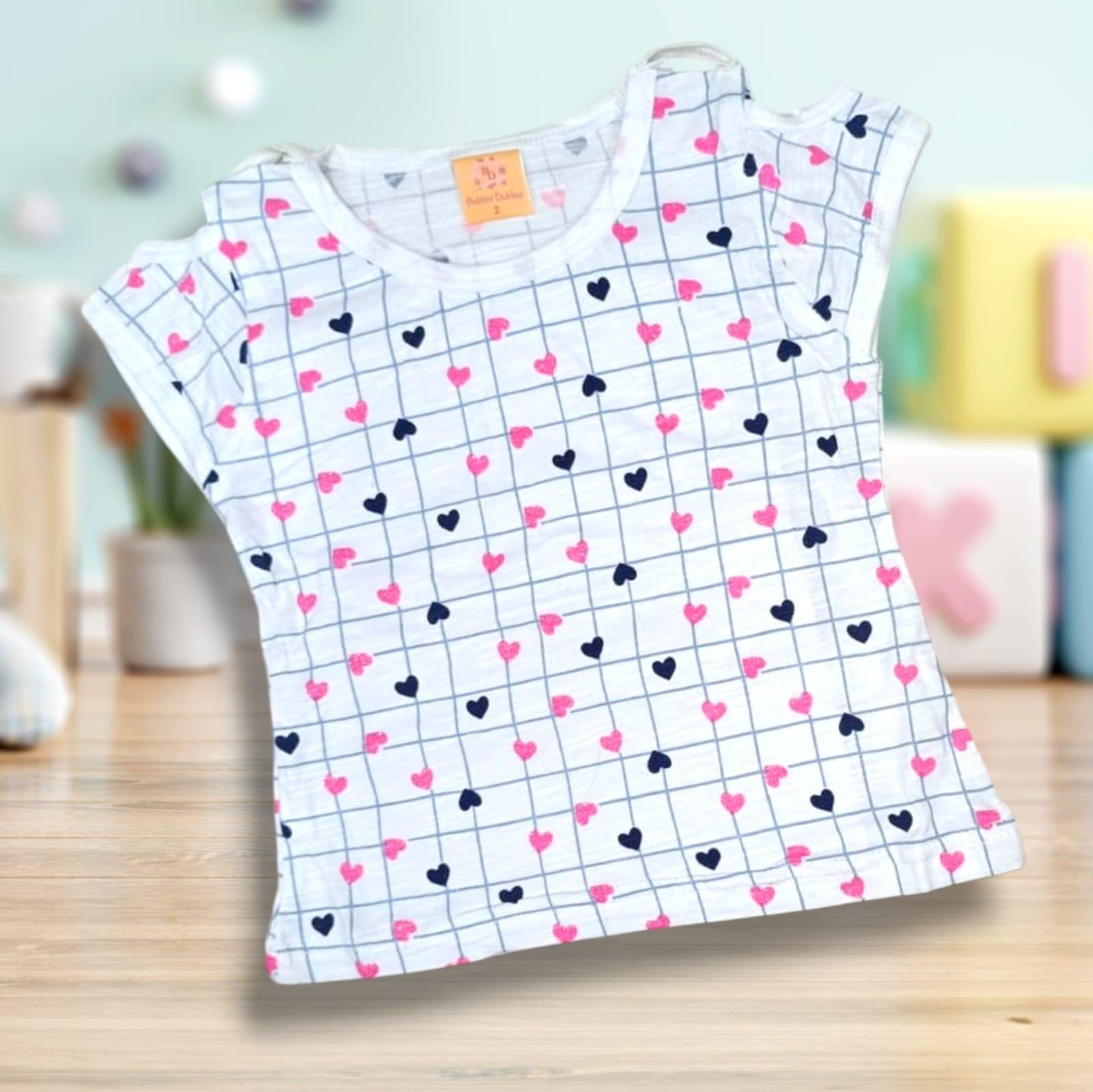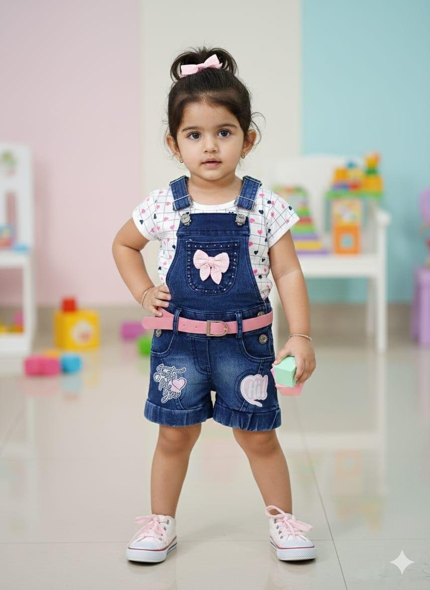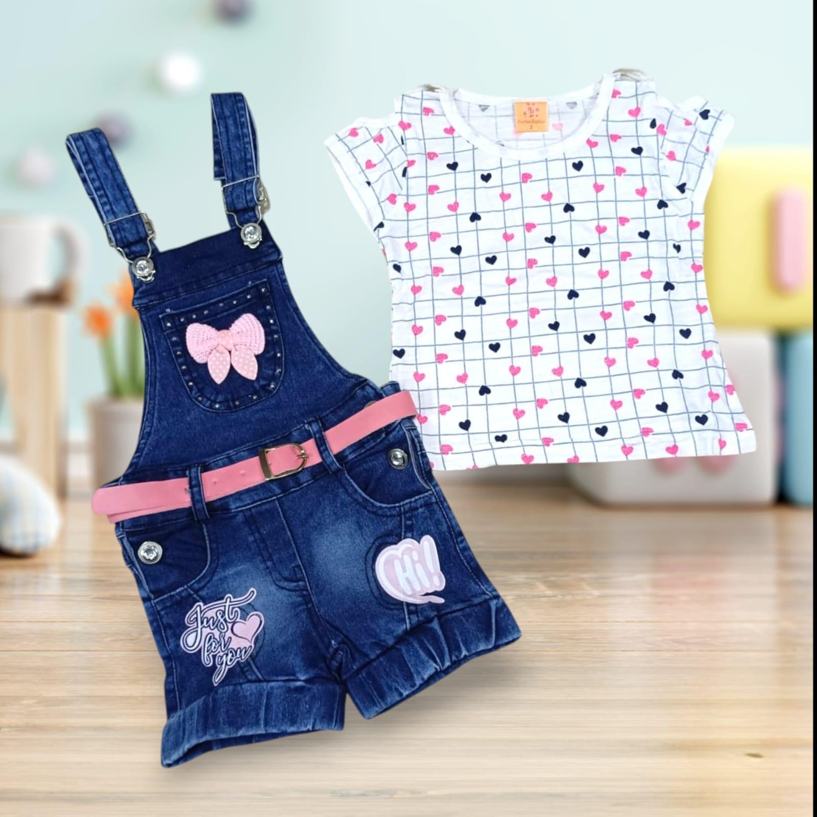 Blue & Pink Kids Denim Dungaree With White Heart Printed Top
