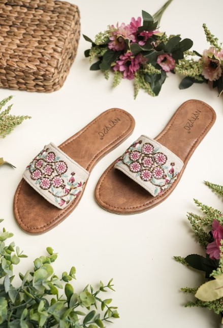 These charming flat slides showcase a soft tan footbed paired with a delicately embroidered strap featuring blush pink floral motifs and subtle pastel accents. The intricate handwork adds a graceful, artisanal feel, while the open-toe, slip-on design ensures easy everyday comfort. Lightweight and versatile, these flats are perfect for casual outings, vacations, or adding a gentle feminine touch to your summer wardrobe.
