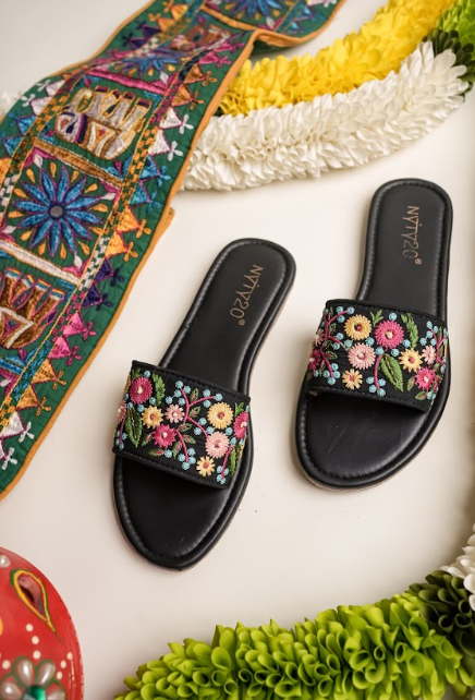 These charming flat slides showcase a soft tan footbed paired with a delicately embroidered strap featuring blush pink floral motifs and subtle pastel accents. The intricate handwork adds a graceful, artisanal feel, while the open-toe, slip-on design ensures easy everyday comfort. Lightweight and versatile, these flats are perfect for casual outings, vacations, or adding a gentle feminine touch to your summer wardrobe.