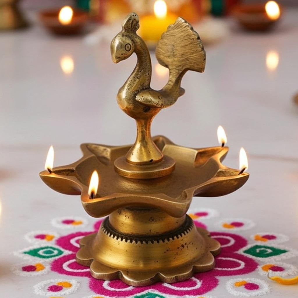 Brass Peacock Diya Jyoti Deepak Oil Lamp 7 Wicks - Large Brass Oil Lamp for Aarti & Temple