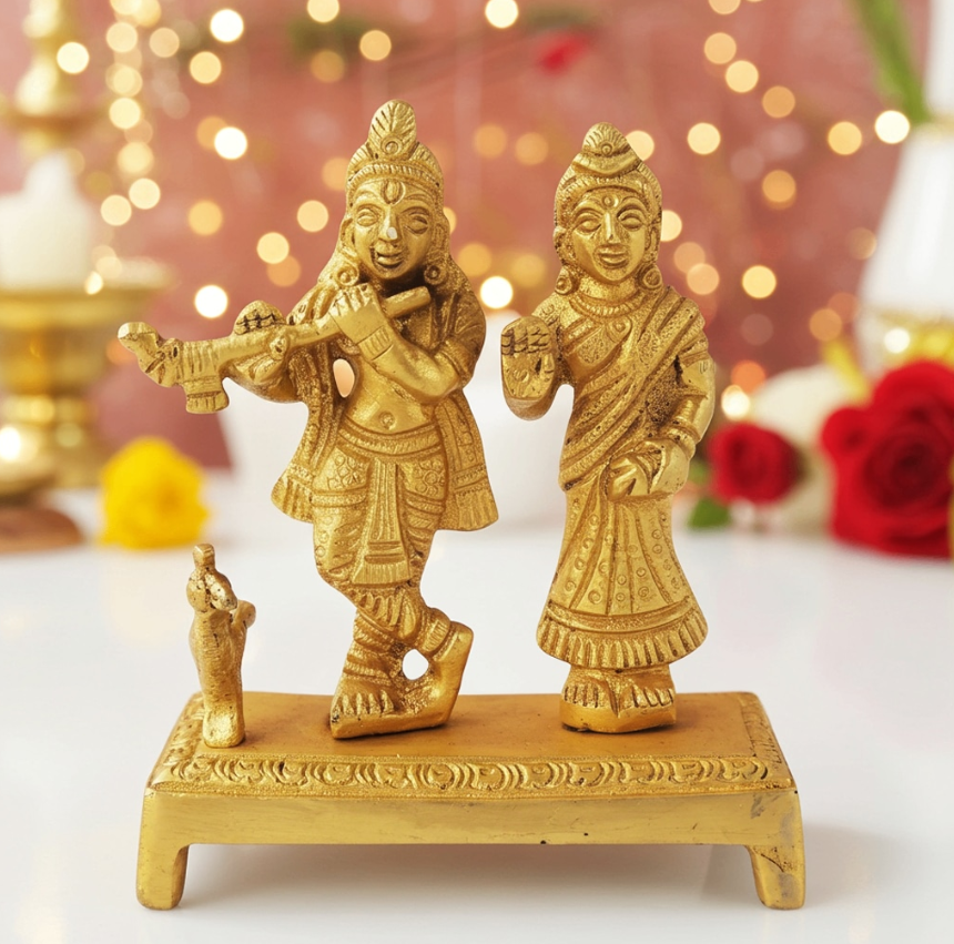 Brass Radha Krishna Idol With Chowki – Puja Decor Statue