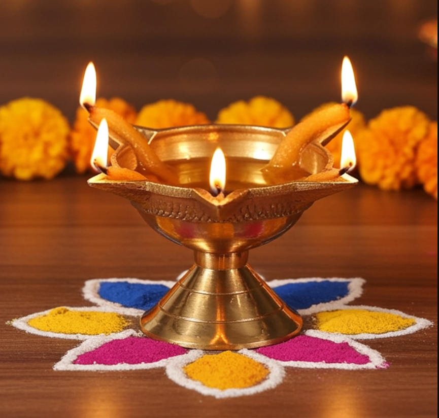 Brass Table Decor Oil Lamp Deepak 4 Wicks - Traditional Brass Diya for Aarti