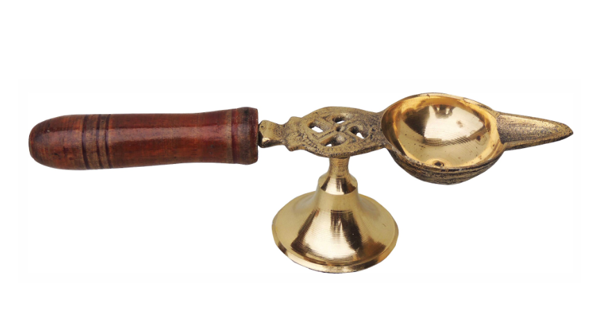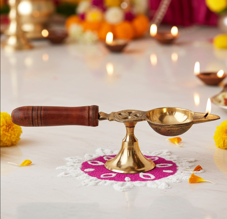 Brass Table Decor Oil Lamp Deepak With Wooden Handle - Durable Puja Deepak