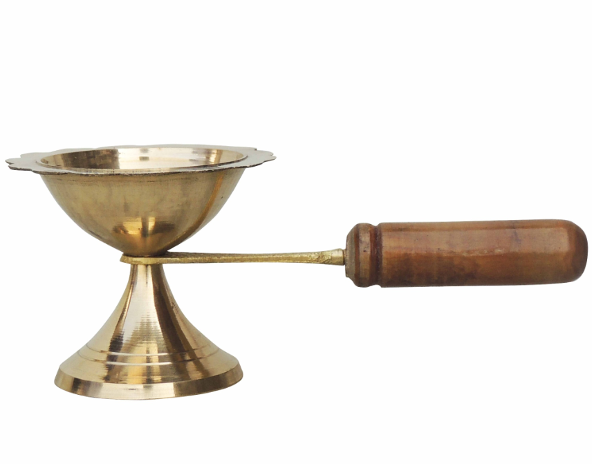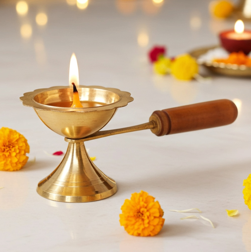 Brass Table Decor Oil Lamp Deepak With Wooden Handle - Handcrafted Brass Diya