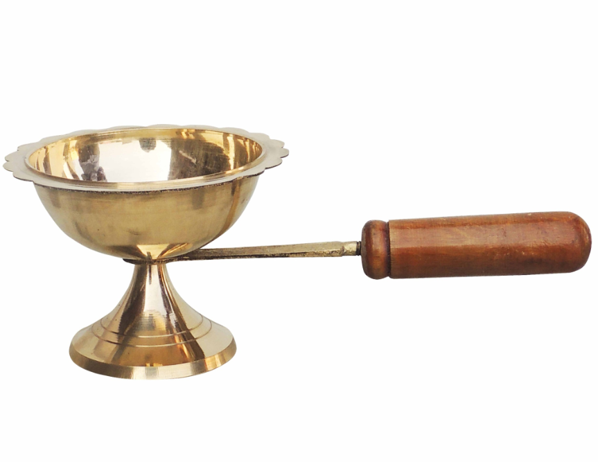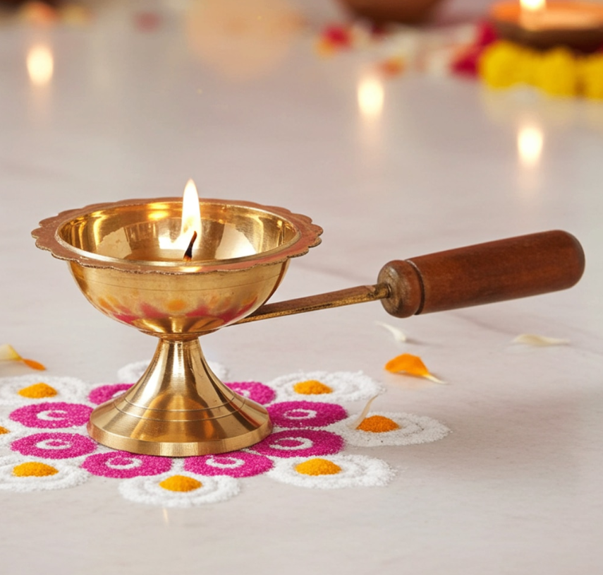 Brass Table Decor Oil Lamp Deepak With Wooden Handle - Puja Diya for Temple
