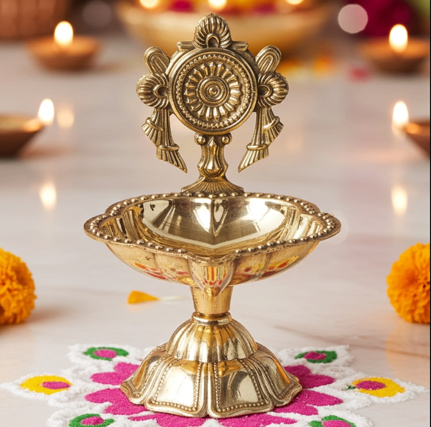 Brass Table Decor Oil Lamp, Shankh Deepak - Devotional Deepak for Puja Rituals