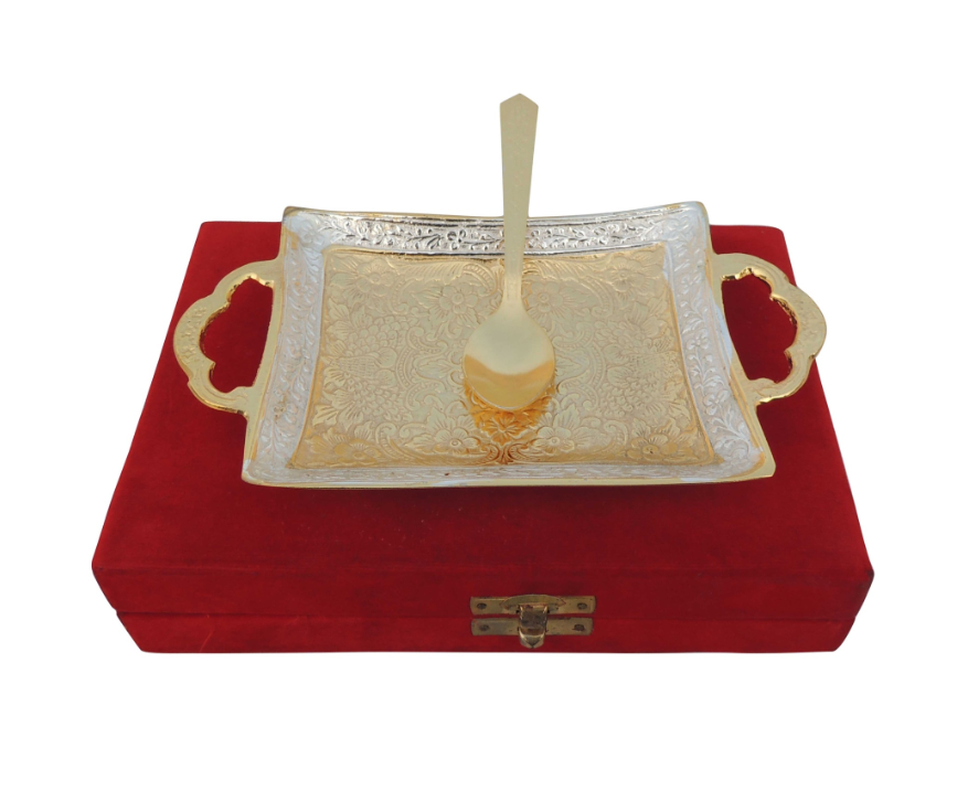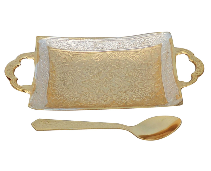 Brass Tray With Spoon Packed In Velvet Box